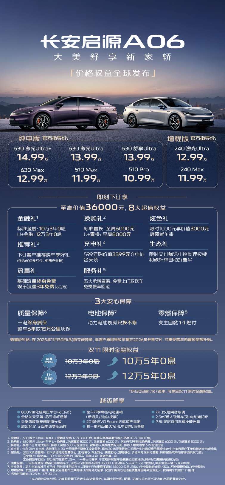 为回馈用户支持,长安启源还推出多重购车礼遇,下订即可享受8大超值权益,至高价值36000元。双11活动之际,长安启源还特别针对11月30日前锁单的用户,升级了限时金融权益,购车可享10万5年0息;其中630激光Ultra+车型更可享12万5年0息!