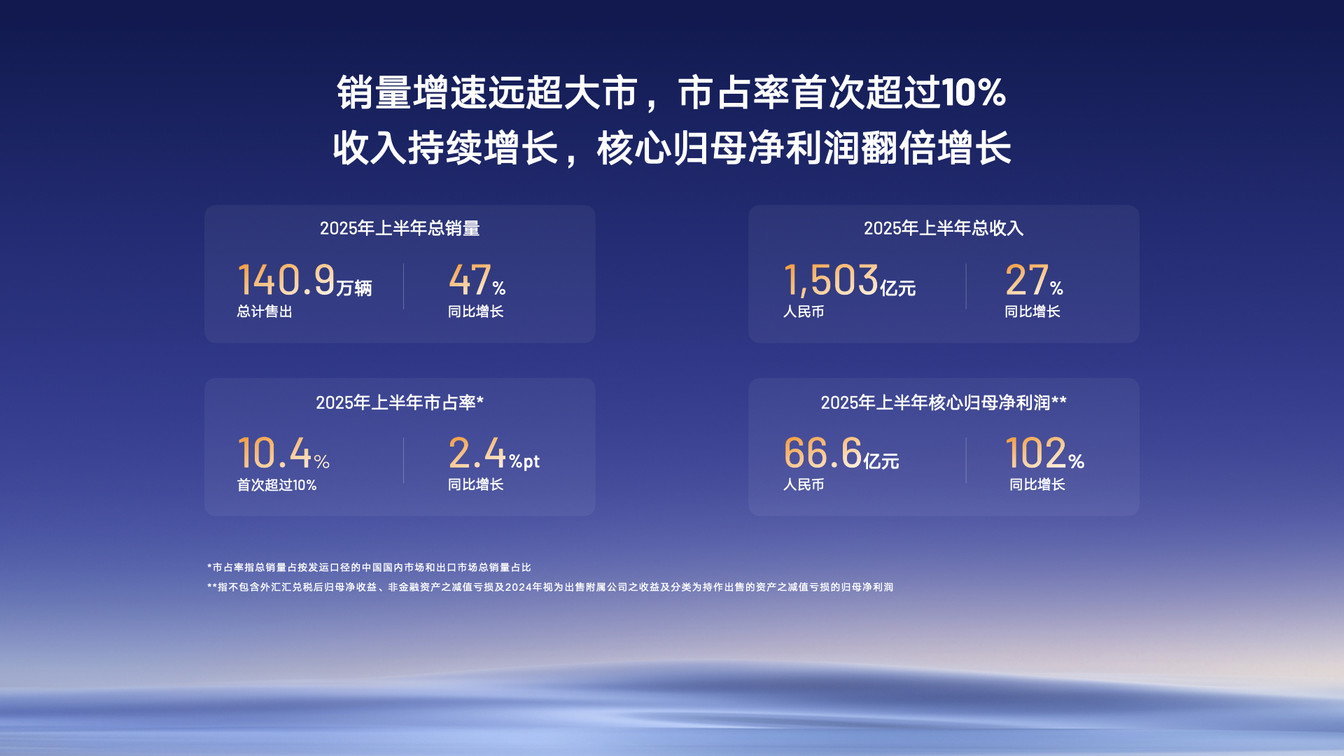 上半年,公司累计销量达140.9万辆,同比增长47%,增速远超市场平均水平,市占率首次突破10%。其中新能源销量72.5万辆,同比增长126%;出口销量超18万辆表现稳定。基于超预期的市场表现,吉利汽车将全年销量目标从271万辆上调至300万辆,彰显稳健发展底气。